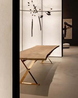 另一項五十週年紀念作品Pathos 50餐桌,桌體採雷射切割青銅框架,搭配實心義大利胡桃木桌面,共構鮮明識別;桌面邊緣特意保留天然未修飾的原始形貌,煥發當代設計的生命力。此作源自於Antonio Citterio 2011年的設計,時至今日再以紀念版本重現,青銅的莊重和木材的粗獷彼此映襯,強化Pathos系列一貫的優雅氣質,也體現Maxalto在「忠於經典」與「持續創新」之間的完美平衡。每張餐桌均附有設計師親筆簽名與限量編號證書。