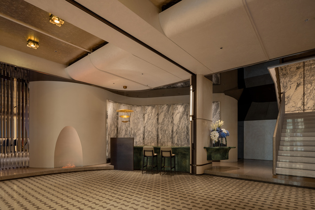 身為體驗起點,大廳是匯聚多種功能於一身的公共空間,在本案中更需連結宴會接待中心和開放式點餐區的機能,設計團隊利用層層遞進的語彙,形塑出立體、有節奏的視覺脈絡;金色金屬和淺色石材交織,宛如城市律動的交響曲,生動悅耳。