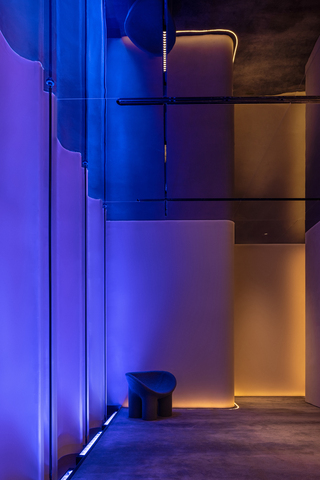宴會接待中心作為賓客進入婚禮與宴飲區的前奏,設計上更為自由奔放,抬高的地台圍塑出獨立感,再運用大量弧形貫穿,並佐以透明玻璃管、鏡面不鏽鋼、LED、水紋燈等,共同交織出年輕且帶有科技感的氛圍,在錯落的光影下帶來充滿情緒張力的感官享受。