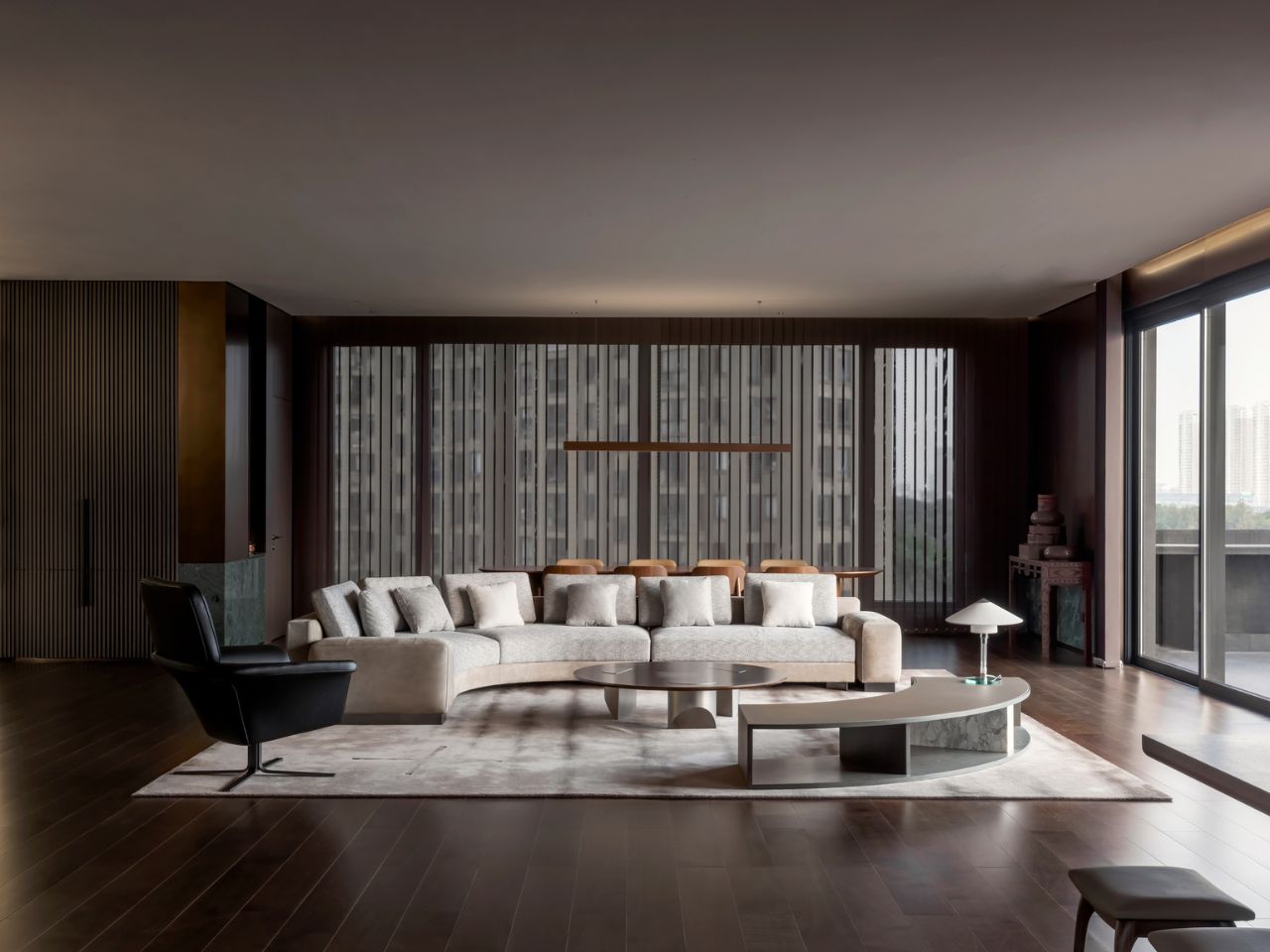 「數字聯動區」以橢圓造型描繪空間輪廓,搭配環形光帶勾勒沉穩與科技感,並隨著光影的交錯轉換心緒。