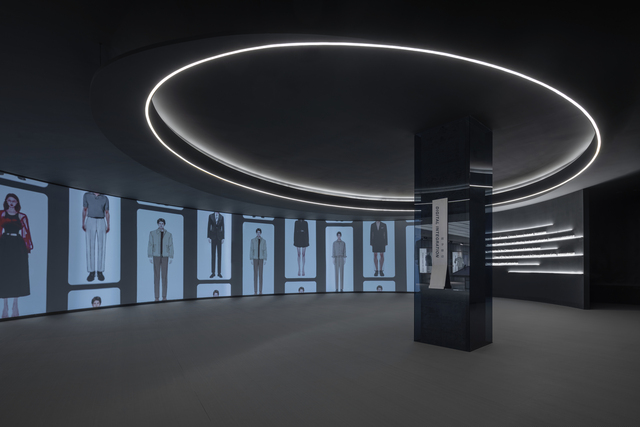 「制服與西裝展示區」中央陳列模特兒展台,為訪客提供360度的觀賞視角,配以隱藏式滑輪與金屬層板等配件,賦予空間彈性及多元性。