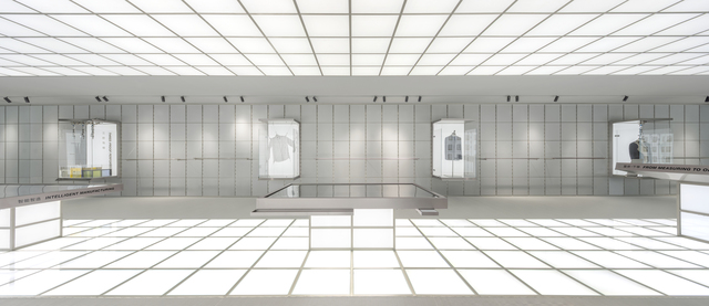 在空間尾聲,「制服與西裝展示區」回歸服飾本質,延續嚴謹的模組化網格系統,展現理性之美。中央陳列的人形模特兒展台,以充滿秩序的陣列方式布局,確保訪客能夠360度欣賞制服套裝的每處細節。展台底部均配有隱藏式滑輪,可讓陳列師如同導演般安排舞台布景,輕鬆重組整個展示區域,搭配上方智慧導光板提供精準照明。