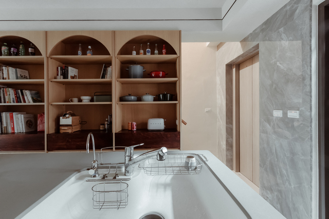 透過拆除原有扶手,樓梯間化為書架與展示牆,並沿路徑布置櫃體,使機能自然融入日常。