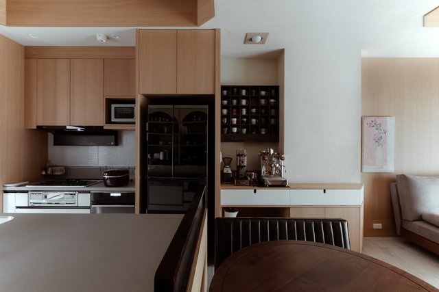步入二樓公領域,開放式客廳與餐廚區以一道大樑為界自然劃分。為營造昭和喫茶店的質樸氛圍,全室立面採用可手工堆疊的稻草漆,其略顯粗糙的肌理,呼應舊時泥牆,並與空間中平滑的實木皮、復古玻璃燈具形成溫暖對比,搭配天花、門片、窗框等線條,描繪老家記憶輪廓。整體色調以沉穩木質為主,細膩襯托玻璃燈具的光澤與輕盈感,特別的是,許多燈具選用帶有拉鏈的款式,重現舊時操作的趣味,仿若重回兒時般令人懷念。