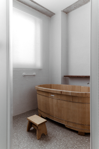 三樓主浴延續整體風格,牆面採用全白馬賽克磁磚,地坪則鋪設帶有綠色紋理的磨石子,呼應屋主對綠色的偏好。設計師特意保留浴缸上方原始的水泥結構樑,展現不加修飾的質樸感,與精緻磁磚形成有趣互動。另外,乾濕分離的規劃中,乾區連接四樓和室通道,使兩層空間彈性共用衛浴。