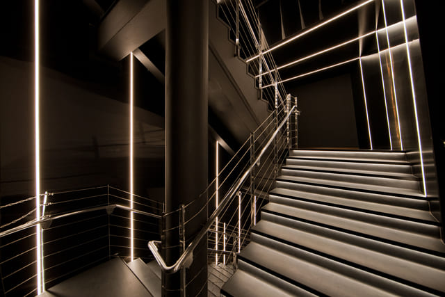 採用銅質踏階台面,每一階嵌入燈條,不僅保證行進間視野清楚以策安全,同時呈現銳利的金屬光感。