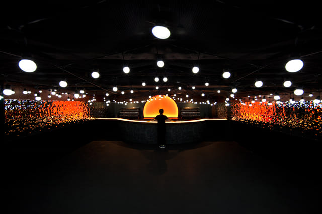 為了容納多元表演和音樂類型,主廳整體設計手法克制,舞台的拱形設計採用極簡風格,提供RGB控制的照明選項,配合上空一如舞台邊框的觀眾席,將視覺重點聚焦於位在台上的表演者。相對熱鬧的主廳,酒吧則是演藝活動以外的另一個重點,反光銅質酒吧後方、仿造太陽打造的燈光裝置喚起海上日落的聯想,定義空間氣氛主調;銅質面板、酒吧台面的石材與耀眼的星光照明設計相得益彰,共構令人難忘的畫面。