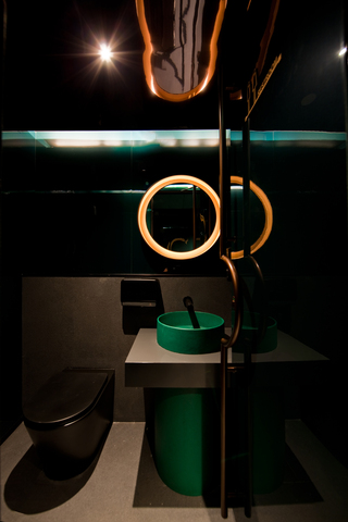 結合水下世界的想像和場景氛圍,設計著重燈光與色調運用,每個細節均旨在引導賓客沉浸於空間敘事,即便次要空間如洗手間,同樣延續場館整體一致的戲劇化用色和材料風格,創造獨特的氛圍體驗。富有高光澤的牆面處理與拋光鋼質配件相結合,結合引人聯想到都會深夜繽紛的霓虹燈光,呈現空靈而沉浸的環境視覺。