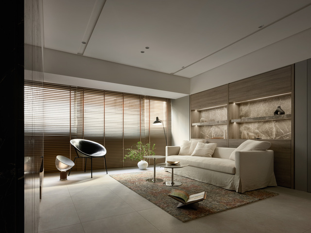 沙發背牆布置開放式木質展櫃,佐以低調的灰色實牆,在虛實交錯間,共構溫潤而沉靜的居家氛圍。
