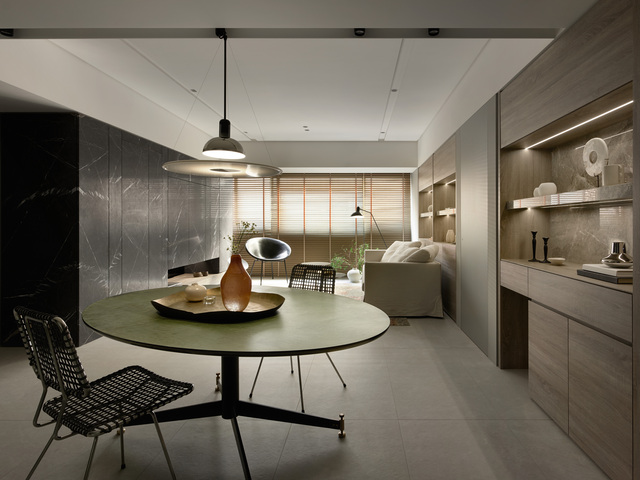 廚房維持獨立配置,與後陽台緊密相連,讓採光與生活機能於此交織。介於餐廚之間的石牆漫開綠色紋理,與餐桌色澤遙相呼應,勾勒出幾許典雅奢意的點睛之筆。全室透過細膩的格局調整,鋪陳出流暢動線,空間彷彿也隨著日常節奏呼吸,在相依相生的秩序中,靜靜承載生活的美好。