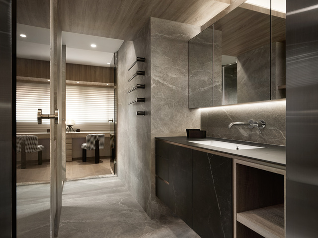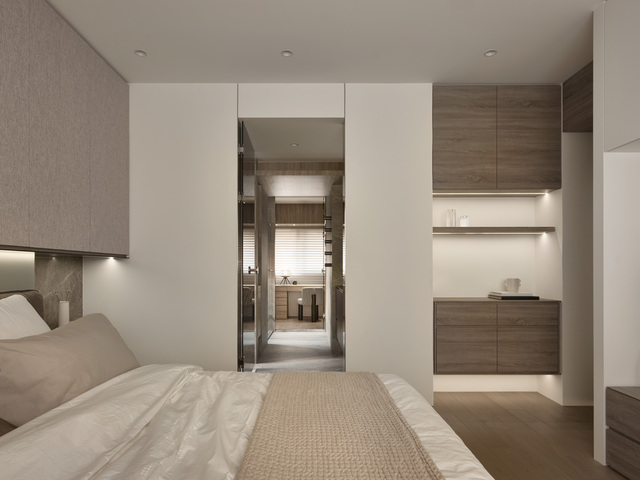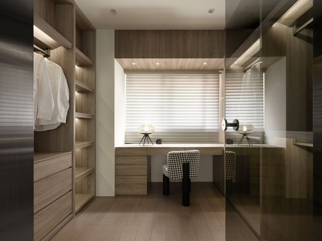 沿動線向深處探索,更衣室巧妙隱身其中,使更衣梳化的節奏自然而然地融入起居步伐。空間在此描繪出流暢的生活場景,在層層遞進之間,形塑層次分明、靜謐而私密的寢居天地。這些取捨與創新,體現設計不僅是美學安排,更是對生活型態的深刻體察。