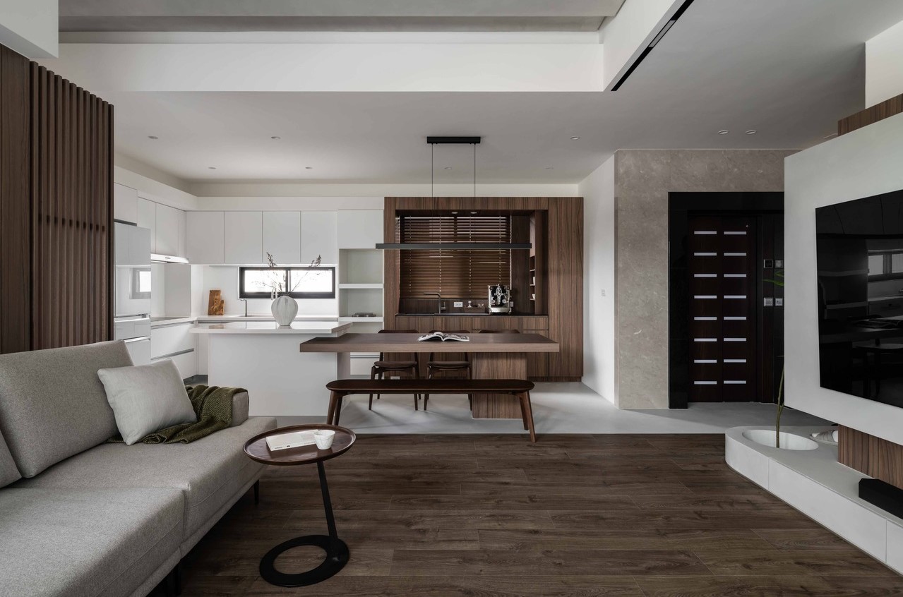 玄關以沉靜之姿迎接來者,延伸入內的碎石與綠意,相伴厚實的水磨石座,讓人安穩落坐整裝,將外界紛擾輕輕卸下。