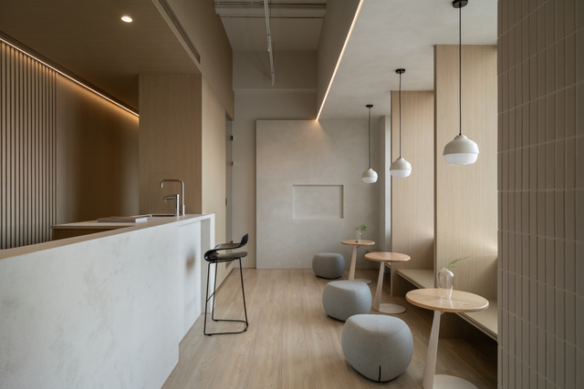 視線再往內,一樓規劃為迎賓與接待區,並以溫潤木質包裹櫃台、辦公室、等待區及通往一樓護膚室的入口。設計團隊以材質界定機能,其木質調包裹之處,即是服務發生的所在,來者無需費心尋找,自然知曉何處等待、何處諮詢,構建流暢的診療動線。