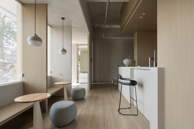 窗畔三席兼具等待與諮詢機能,如咖啡座般悠閒,佐以圓潤桌椅與簡練木作相映,為空間添了幾分柔和。