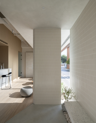從立面延伸至室內玄關的立面,鋪上白色馬賽克磁磚,形成連續而淨朗的視覺語言。特別的是,門面右上角,一枚「2」字的金屬門牌,由設計團隊親手換上,低調地與立面融為一體,顯得乾淨雅致。