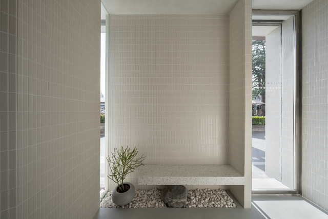 推門而入,迎接來者的不是櫃台,而是一方沉靜玄關。戶外碎石與綠意延伸至此,與一張水磨石板座椅相遇,其座椅如大地生長的石頭般厚實溫潤,來者可在此從容換鞋,將街上市聲留於身後。