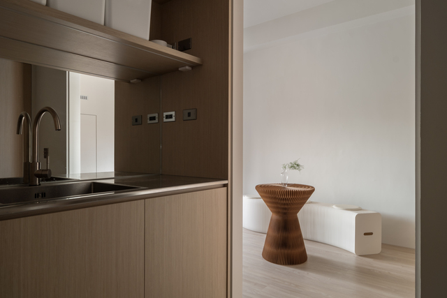 左側設置一面鏡牆,同時在後方藏匿配電箱,讓空間有了視覺延伸的錯覺。設計師提及,這面鏡子就如家中的穿衣鏡,讓完成護膚療程的客人,能夠即刻看見煥然一新的自己,彷彿回到最放鬆的家中,連離去,也成為一種溫柔儀式。
