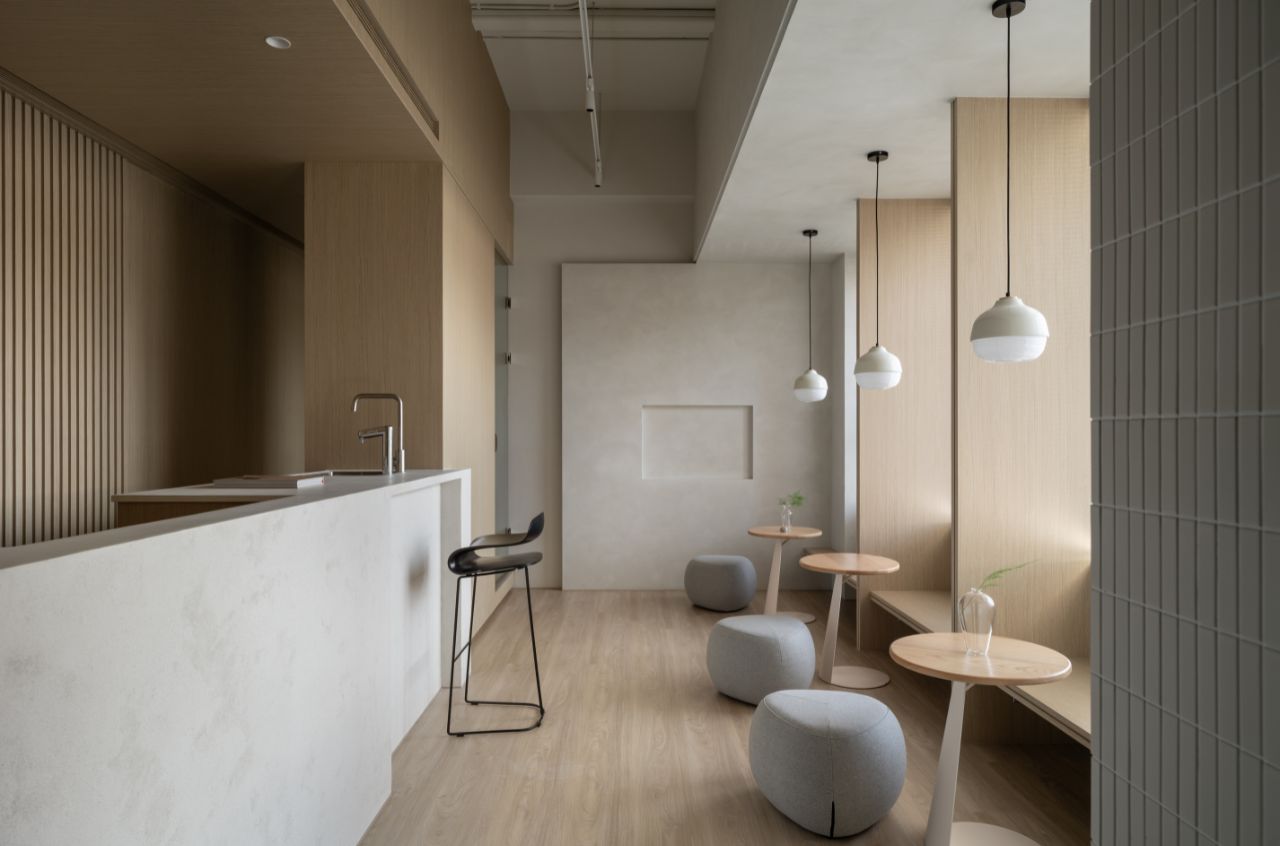 空間以米白、灰、褐色交織出沉靜的西北地景,而跳躍其間的朱紅,則為場域注入一抹來自大唐長安的歷史溫度。
