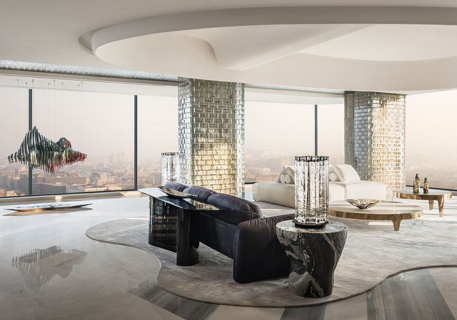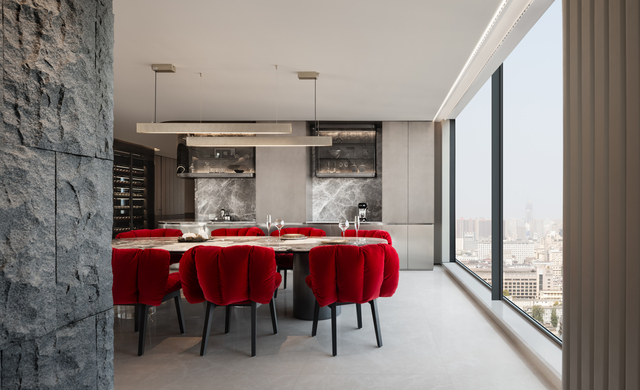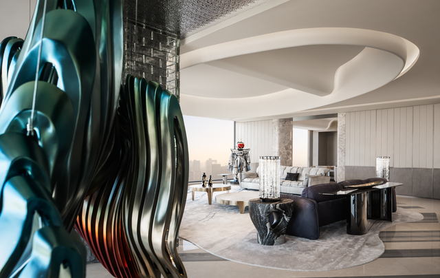 天花以流動曲線在空間中延展,象徵山勢與地形的起伏,而位於正上方的大樑結構,則經由3D模型反覆推演與精準施工,最終消融於天花流線之中。在客廳之隅,擺放著名為《守衛者》的藝術裝置,有著向古城牆致意的寓意,靠窗處則懸掛著藝術裝置《山語》,其以數位手法重構山的形態,將秦嶺的自然意象帶入室內。