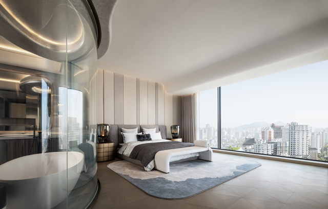 主臥延續曲線語彙與大面窗景,讓屋主在休憩間感受古城氛圍,盡享愜意悠然。