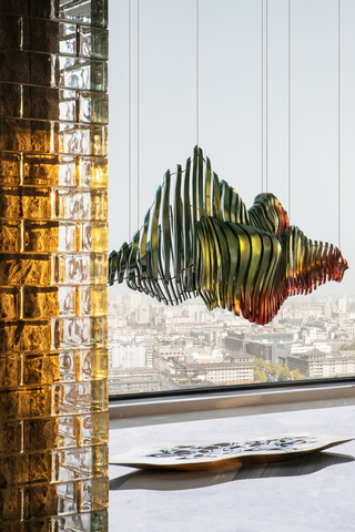 空間柱體以玻璃磚堆疊而成,其肌理隱喻城牆的厚重,卻又保留現代材料的通透感,引光影自由穿透,搭配紅色絲絨質感單椅,點出大唐「尚紅」的脈絡,展現地景與人文的優美交織。