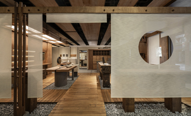 以品牌理念為設計核心,傳遞讓客人在配戴品牌飾品的同時觸發即刻假期的聯想,從而放鬆身心感受,期待在熙來攘往的商圈中,創造一個安穩的場所。半透的布幕圍塑場域,並開口讓內外產生有趣的窺看關係,透由行走路徑的體驗使空間與時間產生置換與抽離,空間中的道具以萬物皆平衡才存在為概念製作,宛如匠人的工作室,展現安定與寧靜的場景氛圍。
