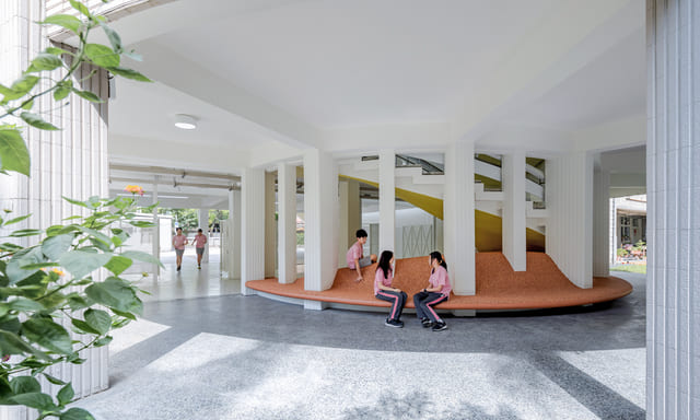 芳和實中隨教育模式創新陸續改造,唯獨歷史49年的穿堂遲未升級。隨現代化教育模式的變革,校園已成社區一部分,打造友善多元環境勢在必行。改造方向由外而內,首先移除原門扇,模糊校園與城市邊界,其次改造旋轉樓梯區凝聚空間核心,結合展示、公告與休憩功能,促進學生互動交流,最後於樓梯下植入以回收橡膠面材,連結綠地與廣場。透過介於遊樂場與藝術裝置之間的互動場景,回應芳和實中勇於探索與挑戰的勇氣。