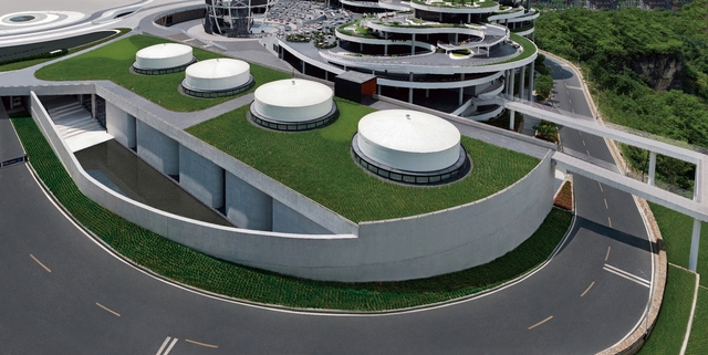 這棟位於大型生態園區的雲上美術館原為酒廠的儲酒廠,特意保留四個既存的鋼製儲酒槽,承載企業精神和歷史故事。偌大建築以清水混凝土為主體結構,僅頂部凸出於屋頂花園外,室內透過牆面與天花上道道裂隙般的開口,串連天光流動的途徑;室外則在館外水池的反射照拂下,每塊混凝土結構都猶如一朵朵漂浮水面的祥雲,創造了實與虛之間的視覺情境轉換。採光和地景藝術的功能,回應了新舊對話、建築融合地景的設計策略。