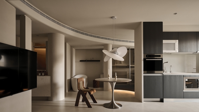 位於美術館蛋黃區的14坪公寓,承載著從事美學設計工作的業主對心靈棲居的渴望。設計師打破傳統隔間的框架,採用連續的圓弧線條,將各功能區自然串聯,營造光影通透、動線流暢的居住體驗。牆面與柱體以溫潤米色礦物塗料覆蓋,輔以木質、金屬及織品的搭配,在剛柔之間展現深邃質感。開放式環繞動線打破封閉格局,讓動線的每個環節都能體現自在韻味。在流動與留白中,塑造出一個既舒適又充滿詩意的居所,讓人徹底「隨寓而安」。