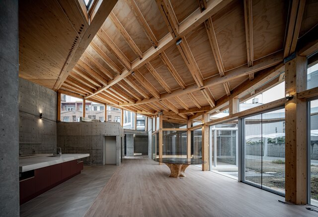 日本有一句諺語「屋根の下」(under one roof),寓意將多元相異的事物匯聚於一處,而本案正是這句諺語的具象化,建築主體採用日本檜木,呈現充滿木質香氣的住家空間。主體結構使用清水模承重牆和檜木製CLT屋頂板,清水模的冷冽整齊性和木材的溫暖交織出空間的對比性質。隨著建築內部空間單元的變化,轉45度的曲面大屋頂會與正交系統的空間產生多元雙斜屋頂型態,隨光影移動,演繹生動豐富的日常面貌。