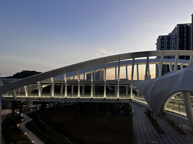 以人本導向為核心,兼顧夜間導引、防眩與環境友善,營造兼具功能性與視覺美感的都市夜間空間。於橋體內部、階梯與平台設置嵌入式或隱藏式燈具,點亮整體動線;配合欄杆與邊緣照明的間接打光,提供明亮卻不刺目的夜間視野。同時導入分時段控制機制,依據人流與時間調節環境亮度,兼顧使用效率與能源管理,降低不必要的能源消耗。此外,透過燈光強調橋體結構曲線與關鍵轉折點,以此構築視覺特色,打造夜間景觀地標,展現南港轉型與都市形象的現代感。