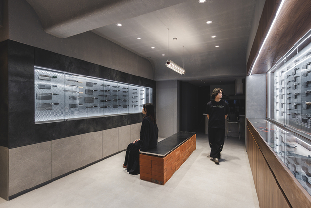 隨著歷史的鋪陳沿階而上,兩側大面櫥窗展示著針對不同生活需求而生的系列刀具。展示區中央特別規劃由紅磚堆疊而成的特製座椅,巧妙連接金門傳統閩南建築的溫潤色澤,可在此感受紅磚的「暖」與金屬的「冷」交織而成的視覺淬鍊;盡頭則設有現代化中島廚房,提供刀具與料理的實地體驗,未來更預計結合直播與大眾分享烹飪美學。