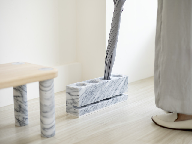 《一方玄關|大理石玄關家具組》正是在這樣的脈絡下誕生。作品由一塊完整的大理石為起點,發展出跟居家風景緊密對應的穿鞋凳、雨傘座、置物盤、筆筒與花器等玄關家具系統,乍看之下再平常不過的物件,其核心命題卻指向石材加工中長久以來被忽略的環節:材料耗損。