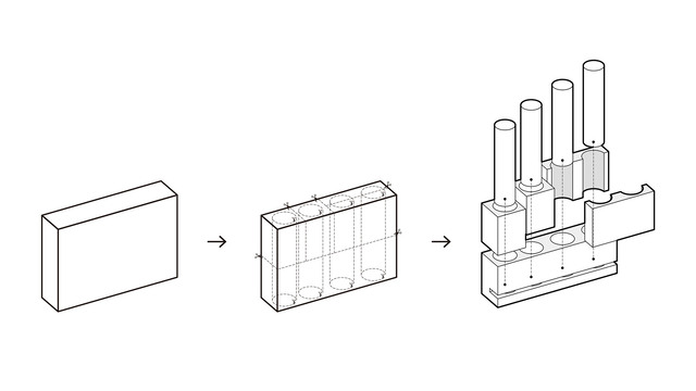 設計理念緊扣「石材利用率的最大化」,相較於金屬或陶土的可塑性,石材只能依賴切割、車銑等減法方式,將不需要的部分層層去除,因此加工過程中的大量餘料儼然已是產業中習以為常的現象;若然設計並未將問題停留在「廢料如何再利用」,而是將提問往前推移:「是否有可能從一開始就不產生所謂的廢料?」
