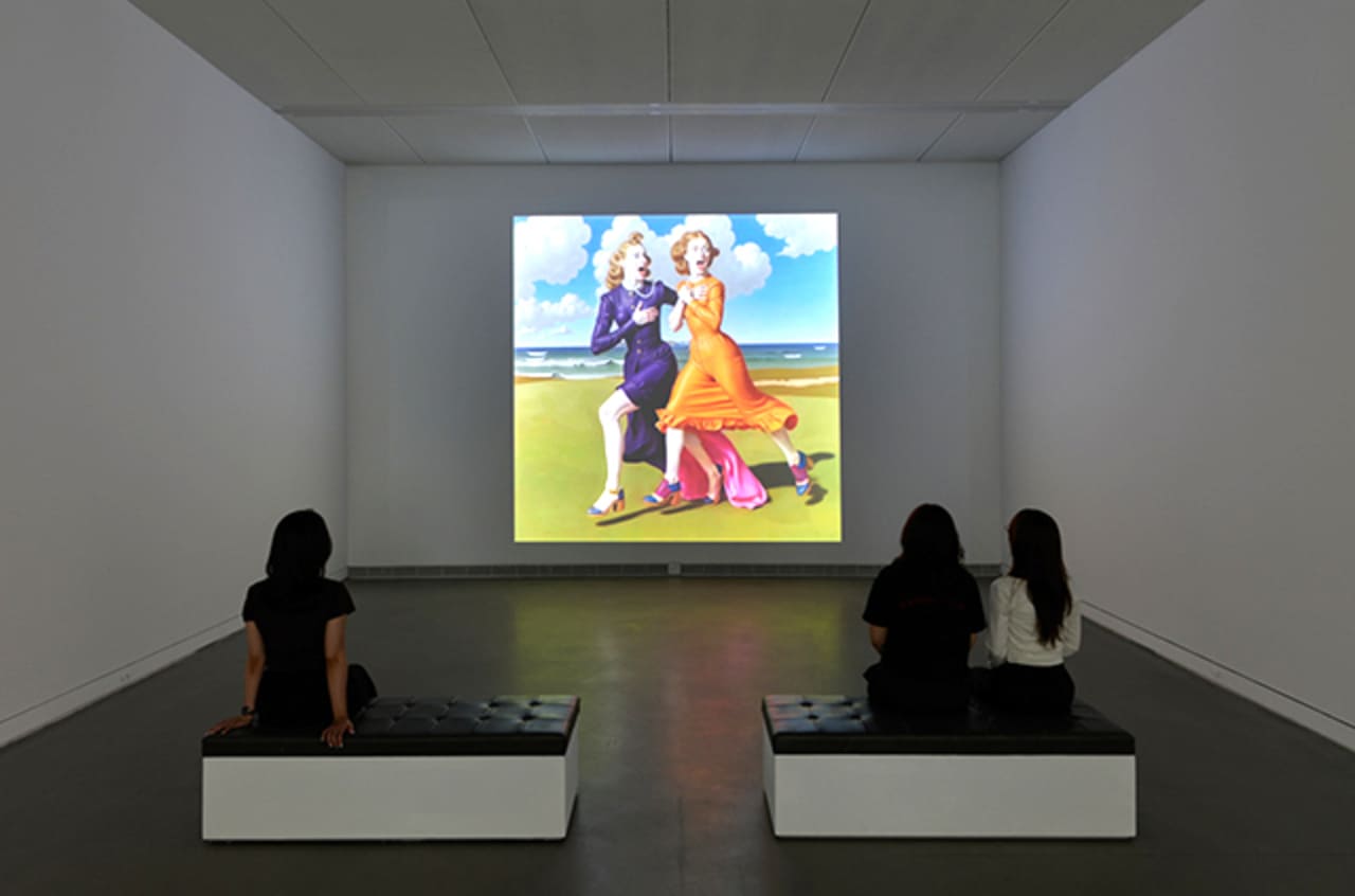 林明弘的《再製》(Processed)則使用台灣花布中極具代表性的梅花圖騰,以兩組相異的手繪圖樣呈現,線條精確與刻意錯位重疊,表現出動態的「生產過程」,試圖引發觀眾思考文化如何被傳播、再製與理解。畫作被放置於入口大廳的兩座玻璃屋上方,必須行走於連通美術館跟圖書館的天橋方能一窺全貌,移動過程中梅花圖樣彼此疊合、分離,讓觀看行為成為創作的一環,與建築、身體、光影共同生成的豐富體驗。