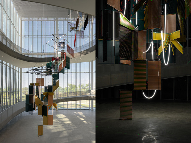 梁慧圭的《流動奉獻-樹蔭三合》為她在台灣的首件委託創作,作品懸吊於中美館挑高27公尺的大廳,以倒懸的「宇宙之樹」回應世界各地敬樹與萬物有靈的文化傳統。金屬百葉簾片構築出如樹葉般輕薄層疊的立體結構,光線穿過細密格柵形成流動的光影印記,入夜後LED燈帶和點狀雷射則如螢火蟲微光。