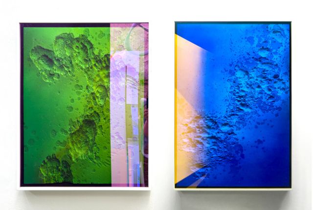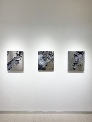 牆上玻璃系列《月面》呈現如億萬年侵蝕的地表質地,透過雙色玻璃與冷冽鏡面、流動色彩交錯,揭示人類對宇宙的渴望與返回自我的旅程。牆上系列《塵之繪畫》則以回收雕塑研磨殘料,層層堆疊成畫面結構,回應物質不滅的永恆命題。