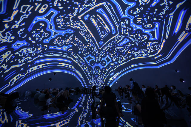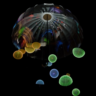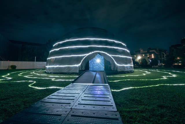 通過穹頂劇場的視聽設備,帶給現場觀眾的體驗不僅止於單方面觀看的視覺,也須留意藝術家巧思營造的互動,串連心靈上的問答,和現場環境的條件,比如奧地利藝術家MONOCOLOR《意識之維》,化用穹頂構造的特點,以點陣呈現人類集體意識與氣候變遷的視覺衝突;以及韓國音像藝術家Kohui《眾聲場:環形運動》,運用多地田野錄音於循環流動中,建構共享的聲音空間。