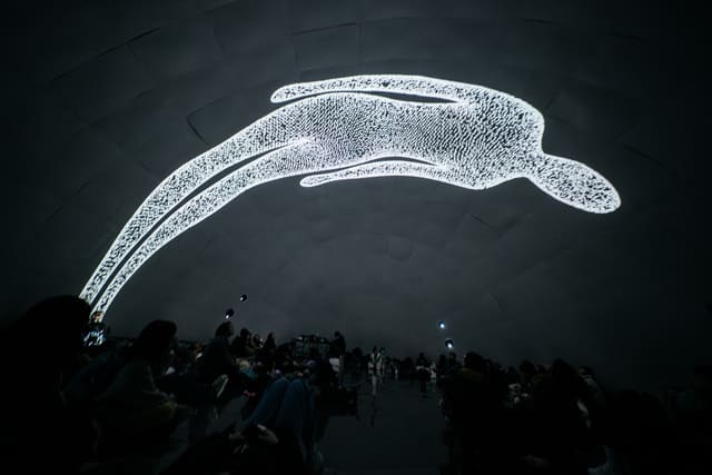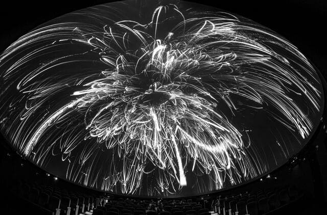 後者則有日本藝術家barbe_generative_diary《描繪寂靜》、韓國藝術家李根耀《共享沉浸:一條街的記錄》、韓國女性藝術家兪志美《非體1》,以及台灣數位光影藝術家謝鎮璘以光的運行與能量流動為核心的《光所到之處》,透過短片形式挑戰穹頂劇場的表現能力,同時表達自己的社會觀點,進一步融入時間、空間與感知的場域互動。
